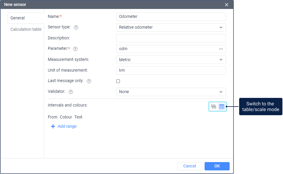 In this section, you can create sensor value intervals, select a color, and specify a caption for each interval. The intervals must be specified for the sensor values obtained after applying all transformations: expression parameters, calculation table and validation.