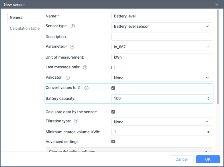 For the battery level sensor, apart from general properties, the options Convert values to %, Battery capacity and additional settings are available. They are shown when the Calculate data by the sensor option is activated.