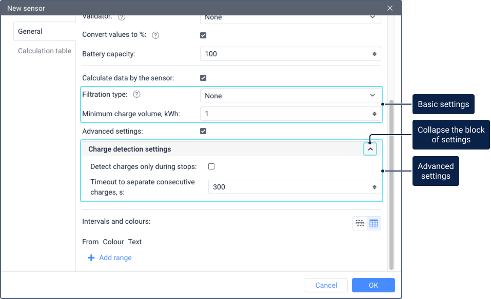 If the option Calculate data by the sensor is activated, additional sensor settings are shown. They are divided into basic and advanced settings.
