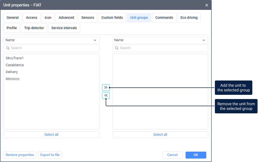 To add the unit to a group, move the group from the left list to the right one; to remove, vice versa. To move groups, use the icons