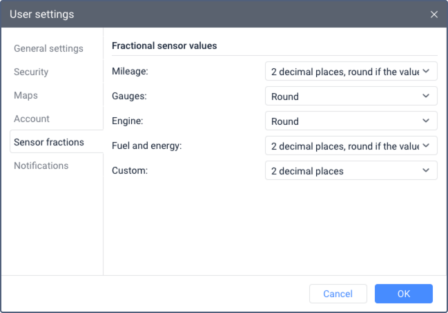 You can select the format of fractional values for sensors from the Mileage, Gauges, Engine, Fuel and energy groups as well as for a custom sensor.