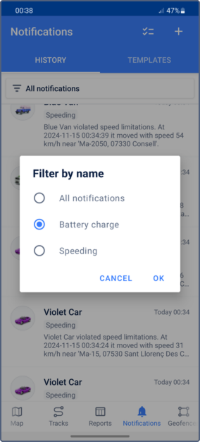 After the notification triggers, you can find the triggered notification on the History tab. You can filter notifications by their name.