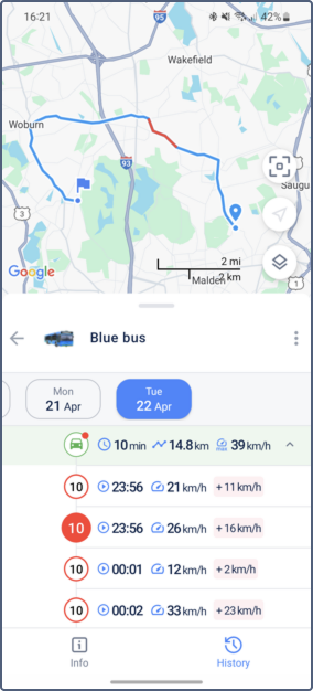 are used to indicate the beginning and end of the trip, respectively. The segments of the track where speeding was detected are coloured in red.