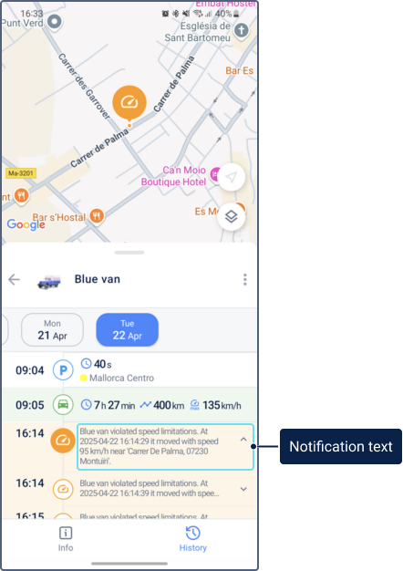 To see an event on the map, tap the required line in the list. The icon in the selected line is displayed in a contrasting color. For example, the icon of the event for the Speed notification type changes from