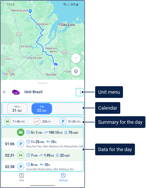 The trip mileage on the History tab may differ from the mileage on the Tracks tab and the Wialon web version. This occurs due to different data processing methods: for the History tab, data is processed in real time, while for the Tracks tab and most reports in the web version, messages from the database are used upon request. In case of such discrepancies, the value on the History tab is more accurate.