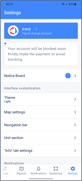 At the top of the screen below the user name, the notifications of an upcoming blocking and messages from the service manager may appear. The digital indicator at the end of the Notice board line displays the number of unread messages. Tap the line to go to their list.