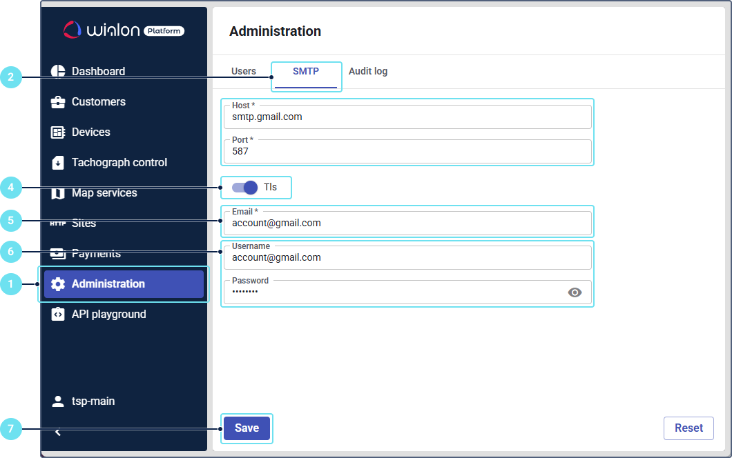 By default, system messages (notifications, reports, etc.) are sent to service providers and customers from the platform@wialon.net email address. However, as a service provider, you can configure your own SMTP server to specify the email address that should be used instead. You can use a custom SMTP server or a third-party service, such as Gmail or Outlook.