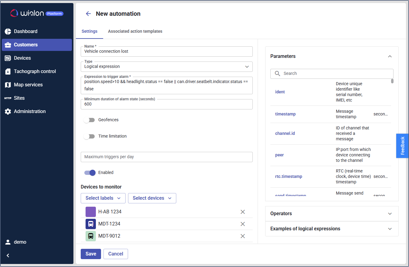 In the Expression to trigger alarm field, create a logical expression using the section on the right. This section helps you find the necessary parameters and logical operators to join them into an expression. Learn more about the logical expression format.