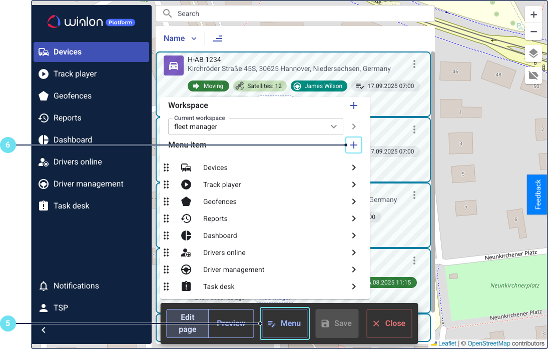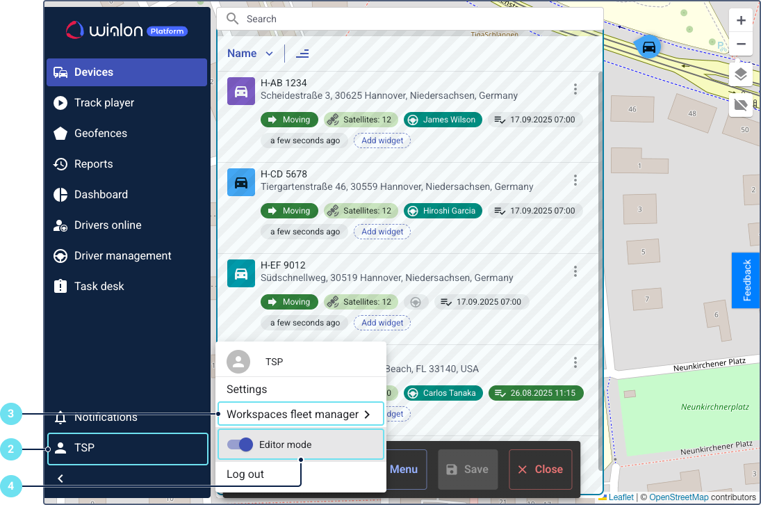 You can configure workspaces in Wialon Platform FleetSpace to display checklist-related sections for your customer users. This process involves adding the Assined checklists and Submitted checklists sections to a workspace and then ensuring that the customer user is associated with that workspace in Wialon Platform Studio.
