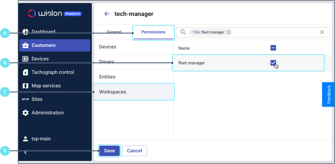 To make the Assigned checklists and Submitted checklists sections available to a customer user, you need to add them to a workspace within Wialon Platform FleetSpace. You can do it by logging in as the customer.