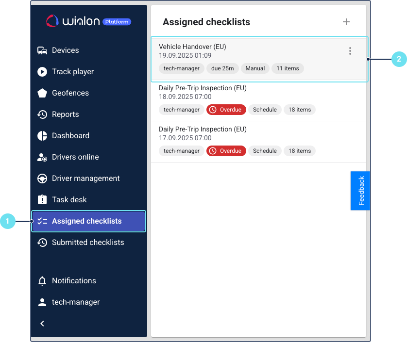 In Wialon Platform FleetSpace, go to the Assigned checklists section.