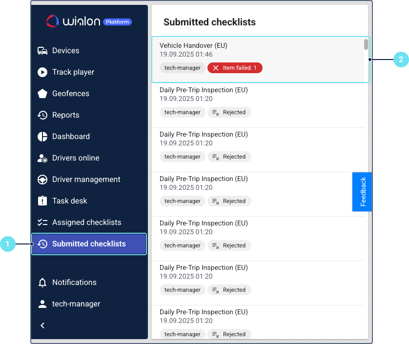 In Wialon Platform FleetSpace, go to the Submitted checklists section.