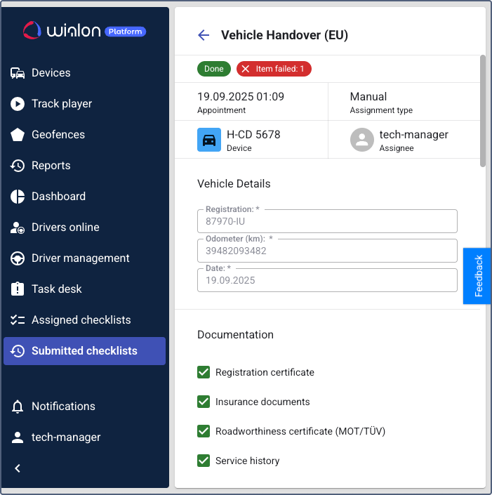 Customer users can review their own previously submitted checklists in the Wialon Platform FleetSpace web interface.