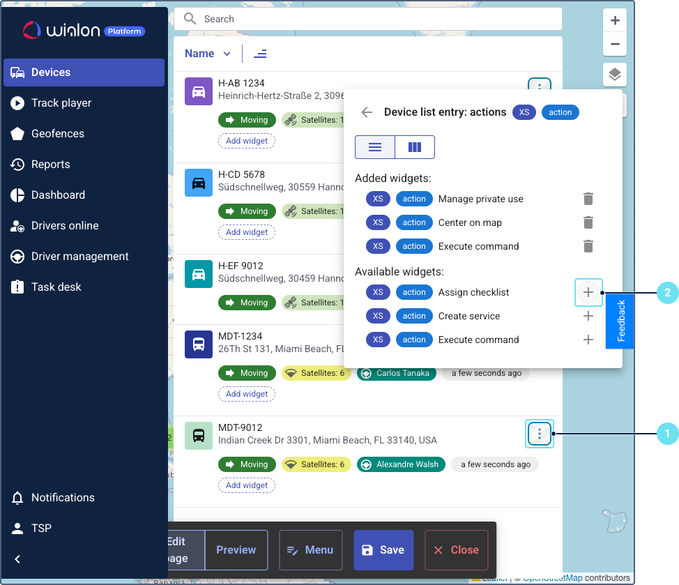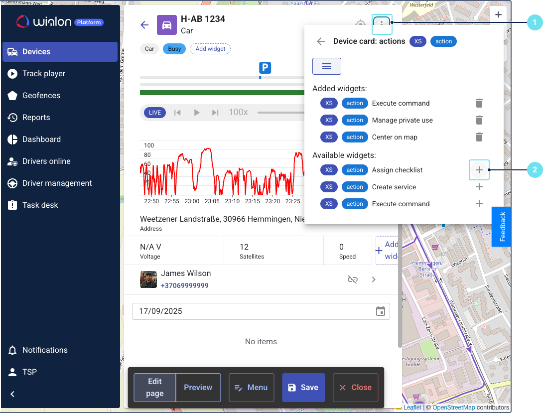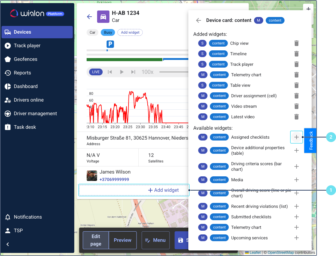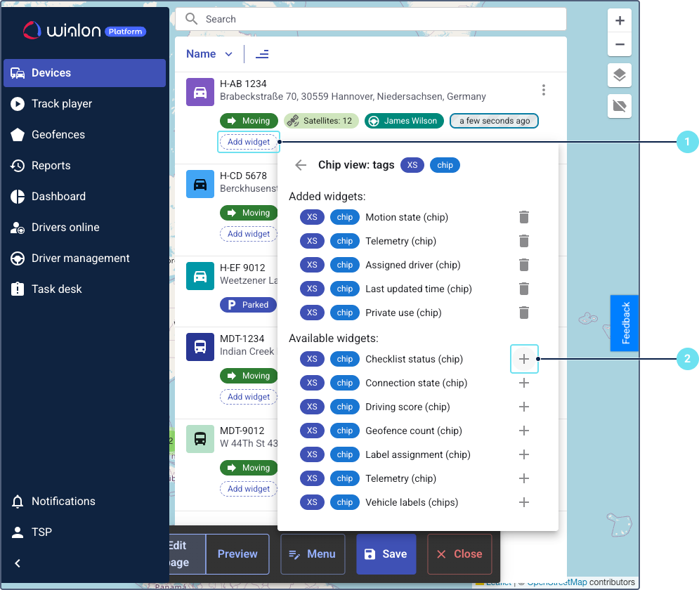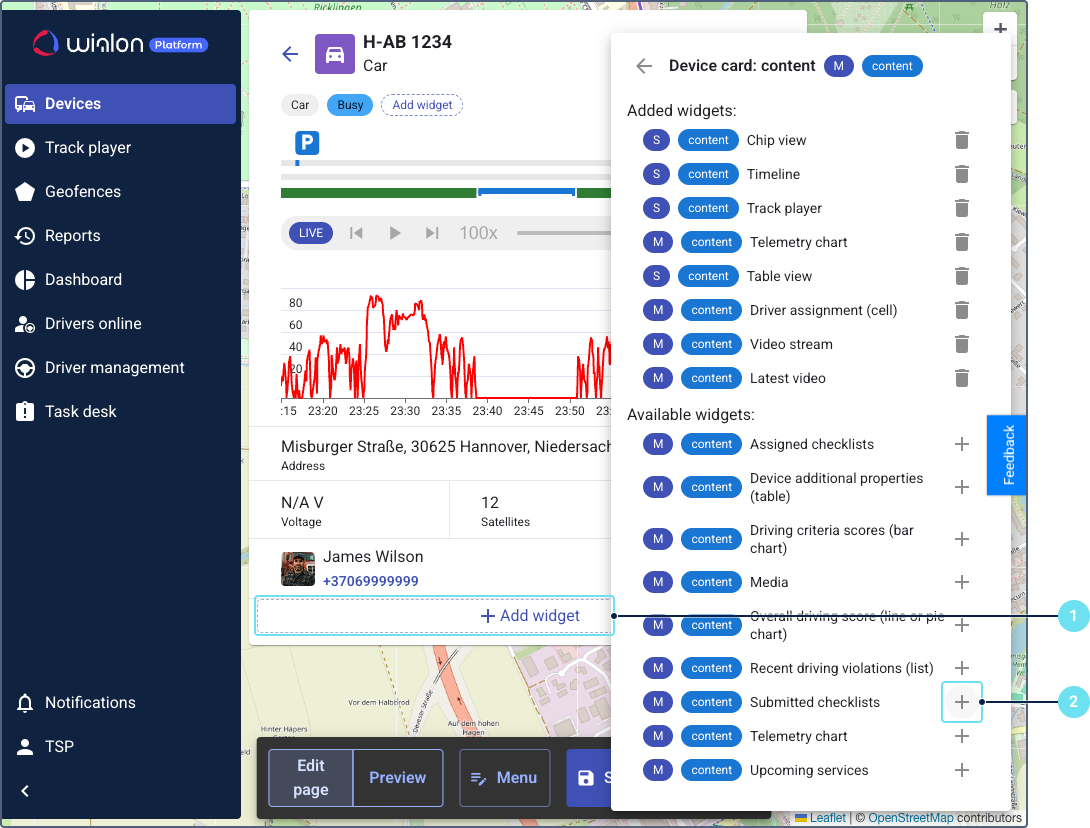 Wialon Platform FleetSpace allows you to customize the information displayed in the device list, device details, driver list, and driver details pages by adding and configuring various widgets. These widgets provide quick access to key data, analytics, and actions relevant to your fleet operations.