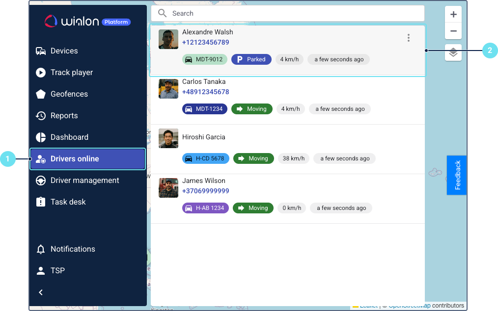 The driver list on the Drivers online page displays a list of your drivers. Widgets here can provide quick actions or summary information for each driver.