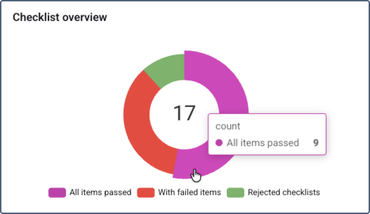 - Checklist overview (pie chart): Displays the total number of submitted checklists and categorizes them by their status: all items passed, with failed items, or rejected.