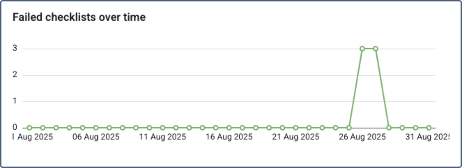 - Failed checklists over time (line chart): Displays the trend of failed checklists over a selected period, helping to identify recurring issues.