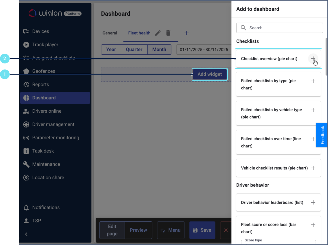 The Dashboard page provides an overview of your fleet performance and key metrics. You can add the following charts related to checklists to monitor inspection trends and results:
