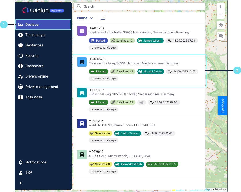 In Wialon Platform FleetSpace, navigate to the Devices or Drivers online tab.