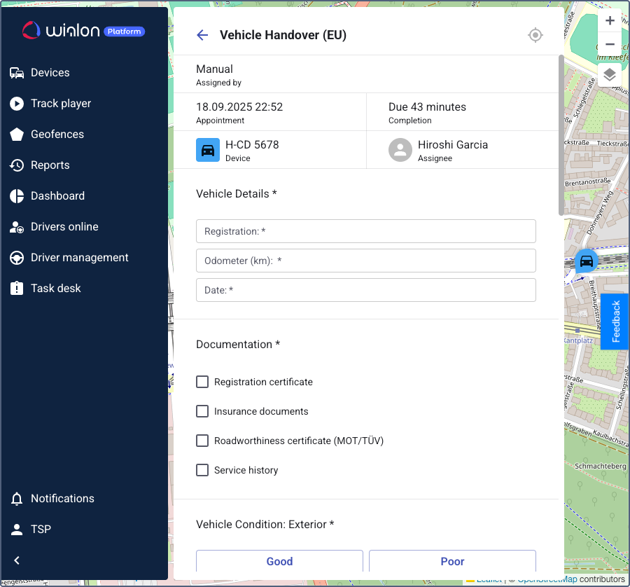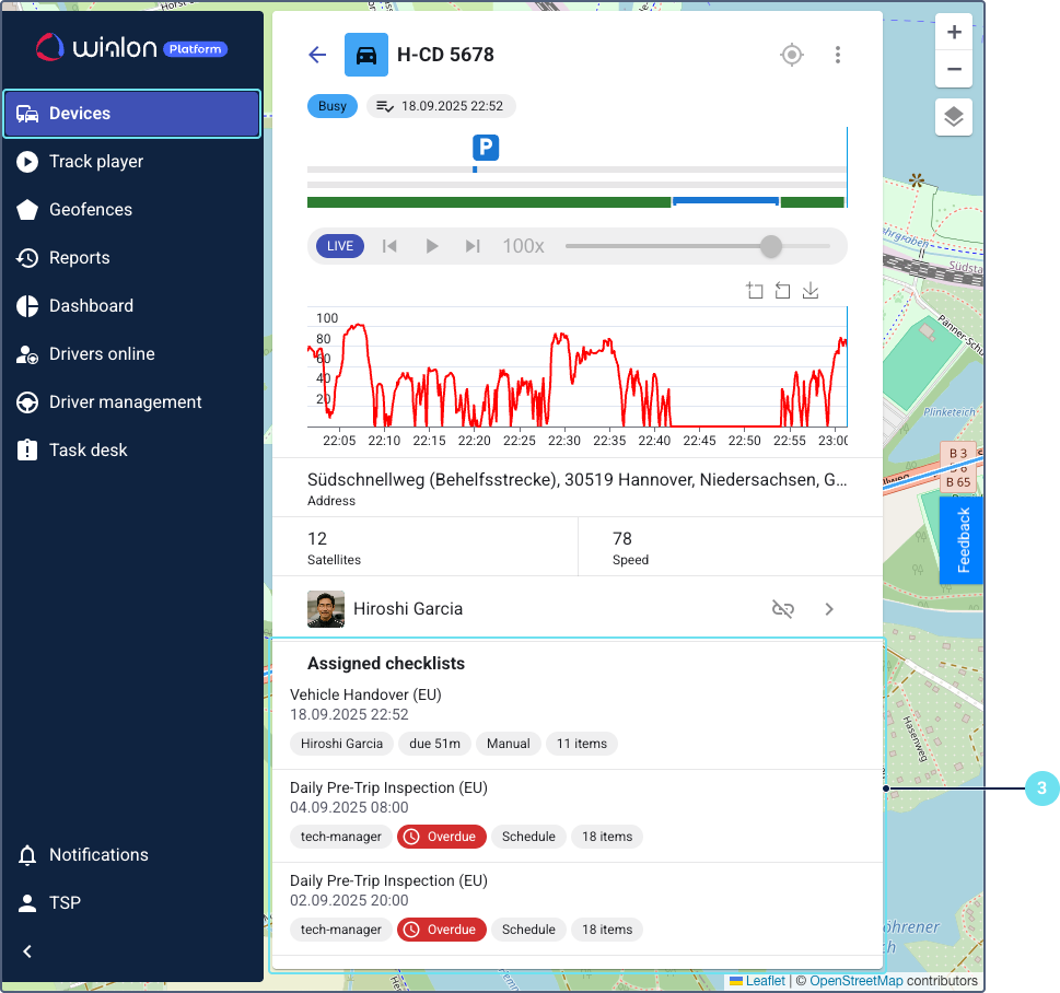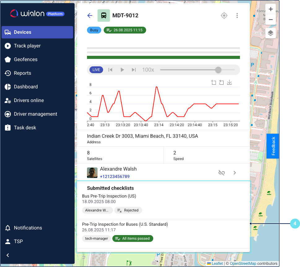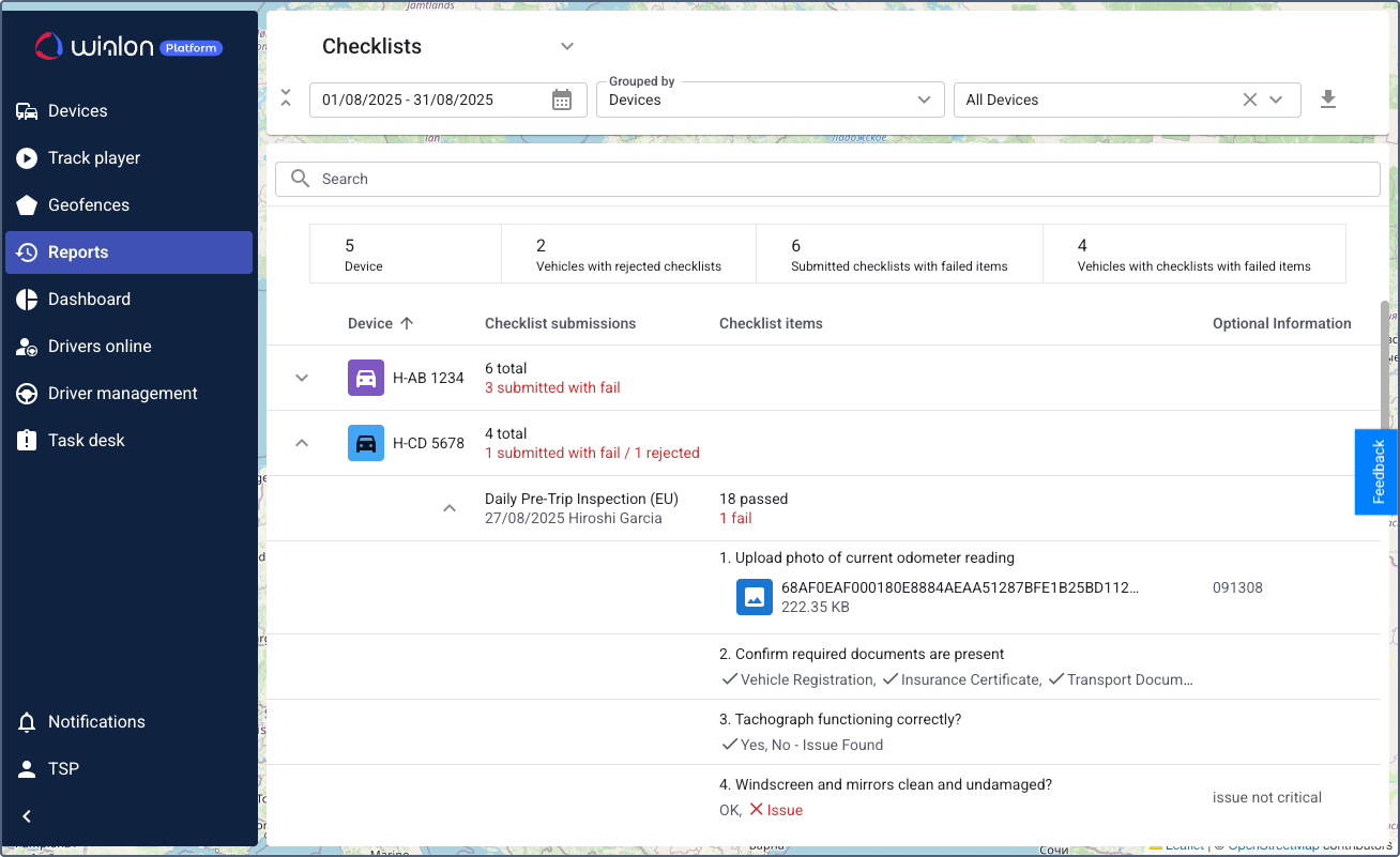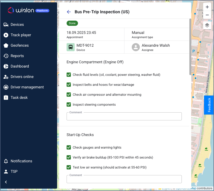 Customer managers can view all checklists currently assigned to devices in Wialon Platform FleetSpace. This allows for real-time monitoring of active inspections.
