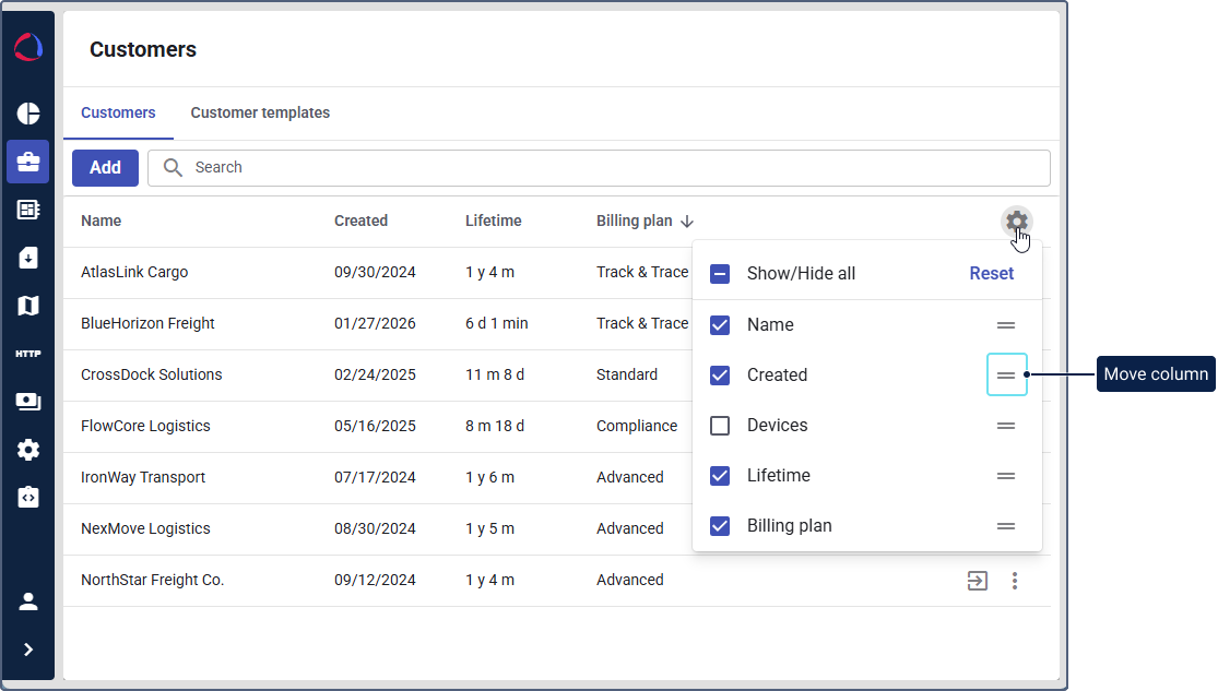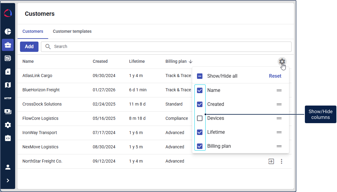 In Wialon Platform Studio, the created customers are displayed in the customer table. You can manage it using the following actions: