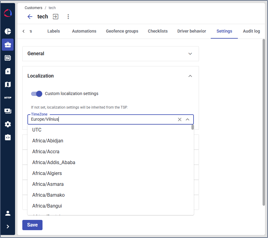 A customer inherits the time zone from the service provider settings by default. You can configure a specific time zone for a customer if they operate in a different geographical region.