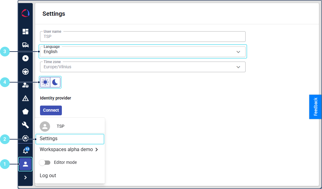 In Wialon Platform FleetSpace, the customer can select the interface language and set the dark mode in the account settings. To do this: