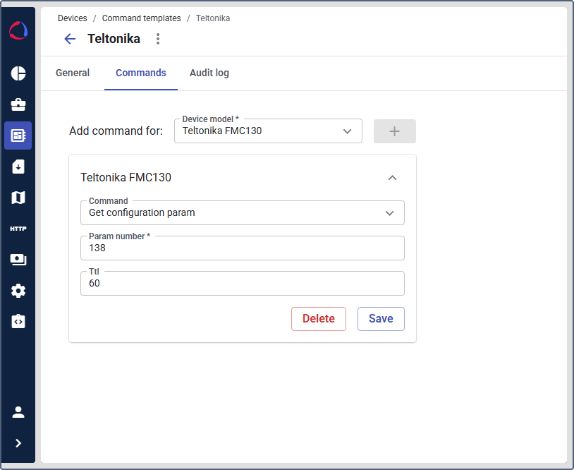 In the Add command for: field, select a device model from the dropdown list. For example, Teltonika FMC130.