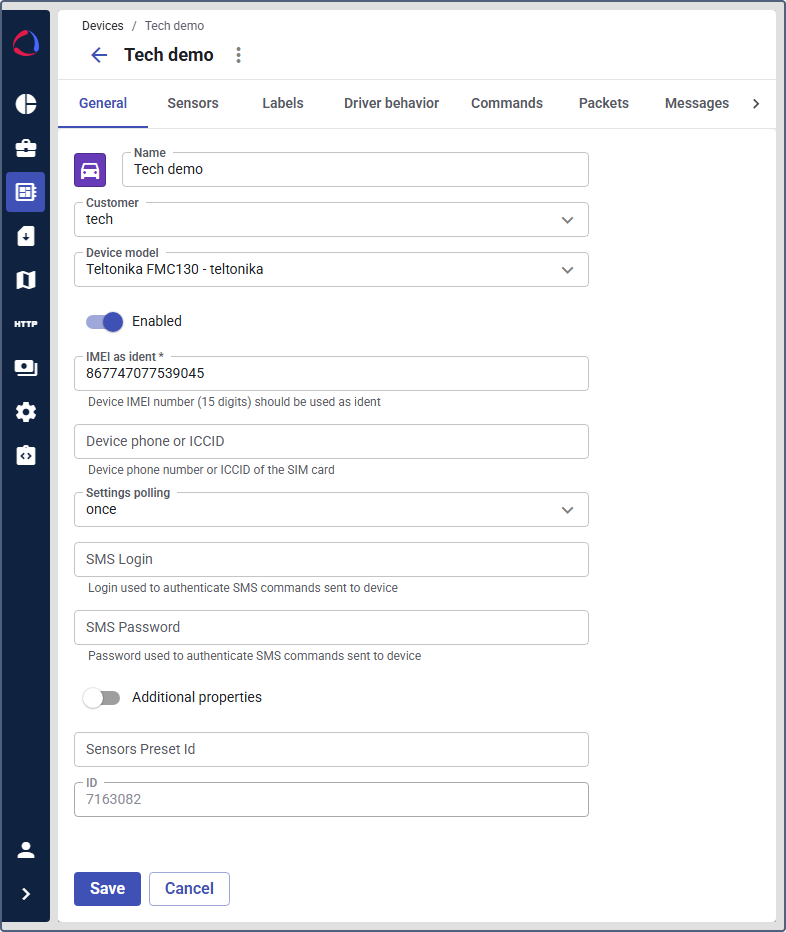 - Select the device model. Use the Device model dropdown to select the correct manufacturer and model (for example, Teltonika FMC130 - teltonika).