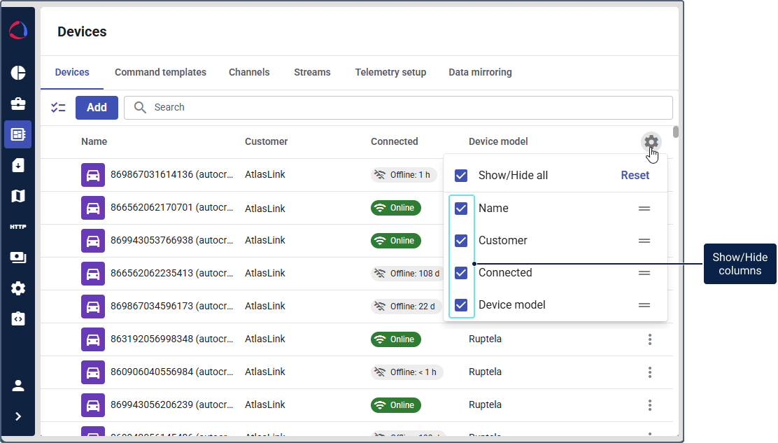 You can sort the devices by name, customer, and device model. To do so, click on the necessary column header. For a descending sorting order, click on the header again.