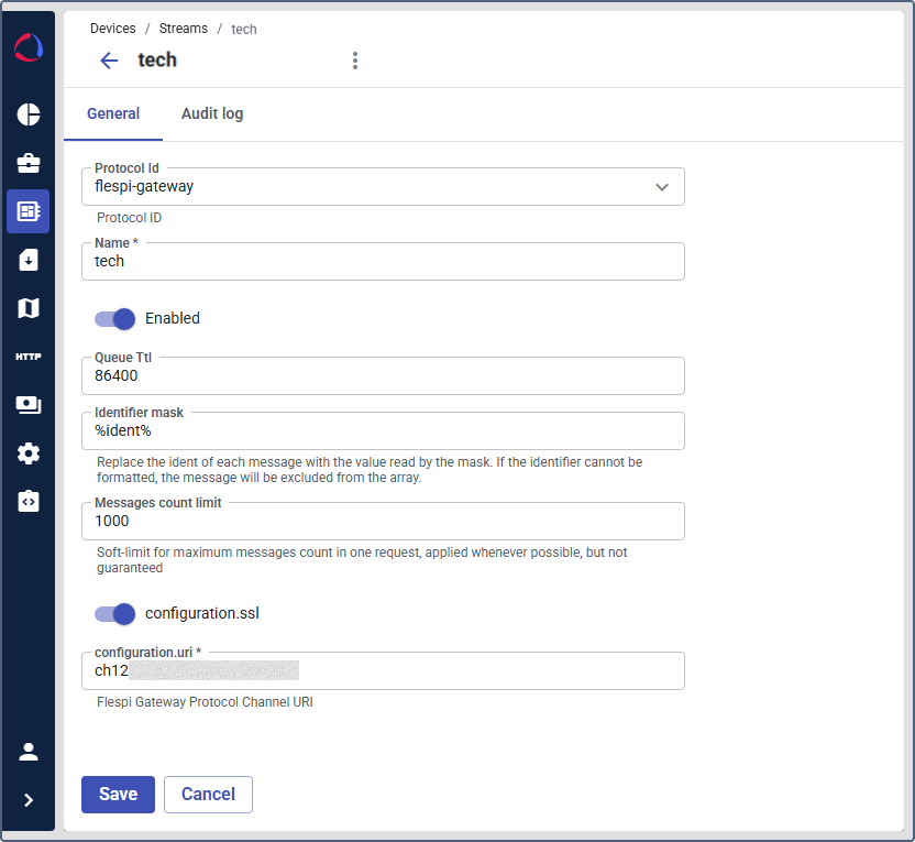 From the Protocol Id dropdown list, select the protocol of the receiving system. This determines the format of the data being sent. See the list of available protocols in flespi documentation.