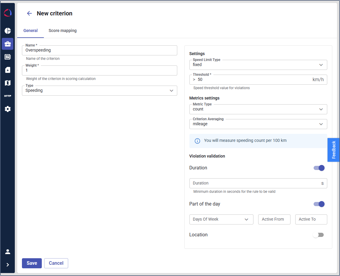For metrics like Speeding count per 100 km, set how many speedings must correspond to a specific score. For example, score 100 corresponds to 0 speedings.