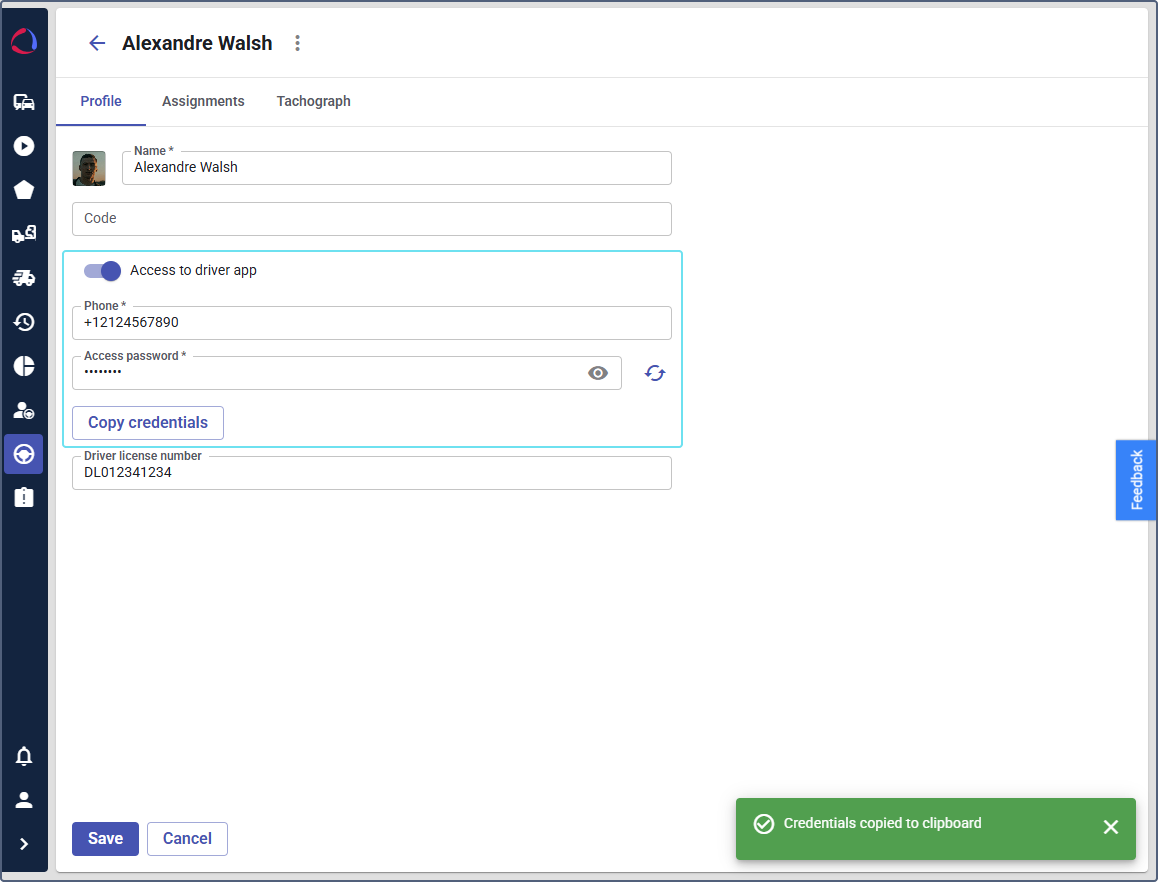 Click the Copy credentials button to easily share the login details (phone number and password) with the driver.
