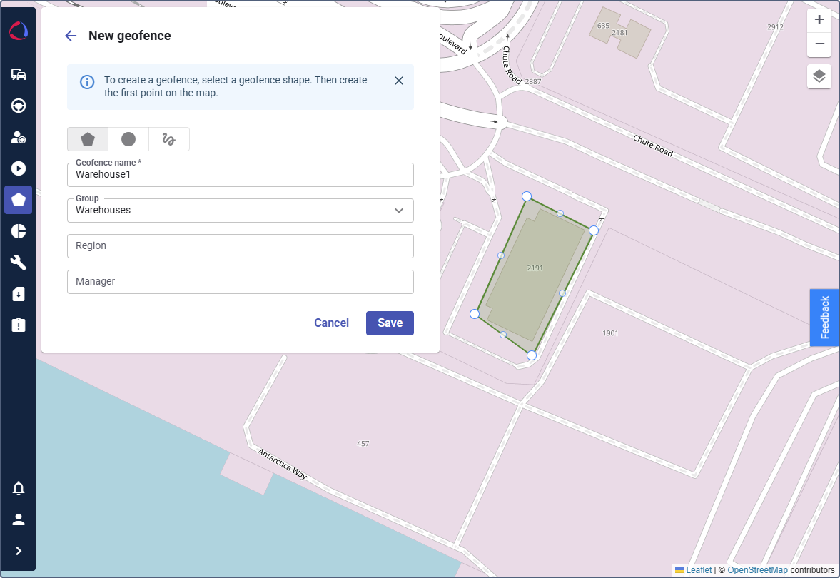 Customers create individual geofences in Wialon Platform FleetSpace. When creating a geofence, it must be assigned to one of the Geofence groups defined by the service provider, inheriting its properties.