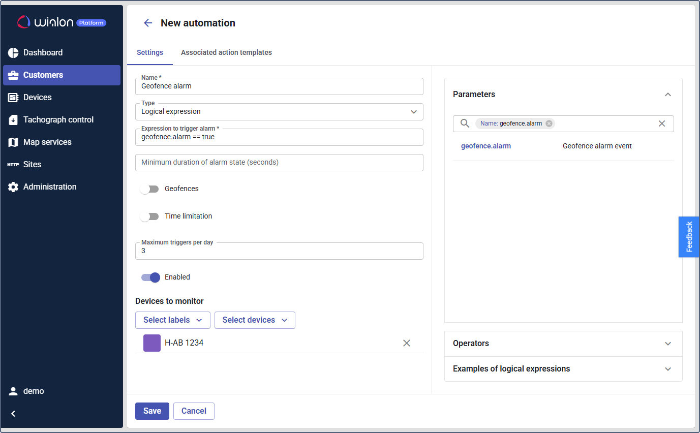 Click on the Expression to trigger alarm field. In the Parameters section on the right, use the search to find the necessary geofence-related parameters, such as