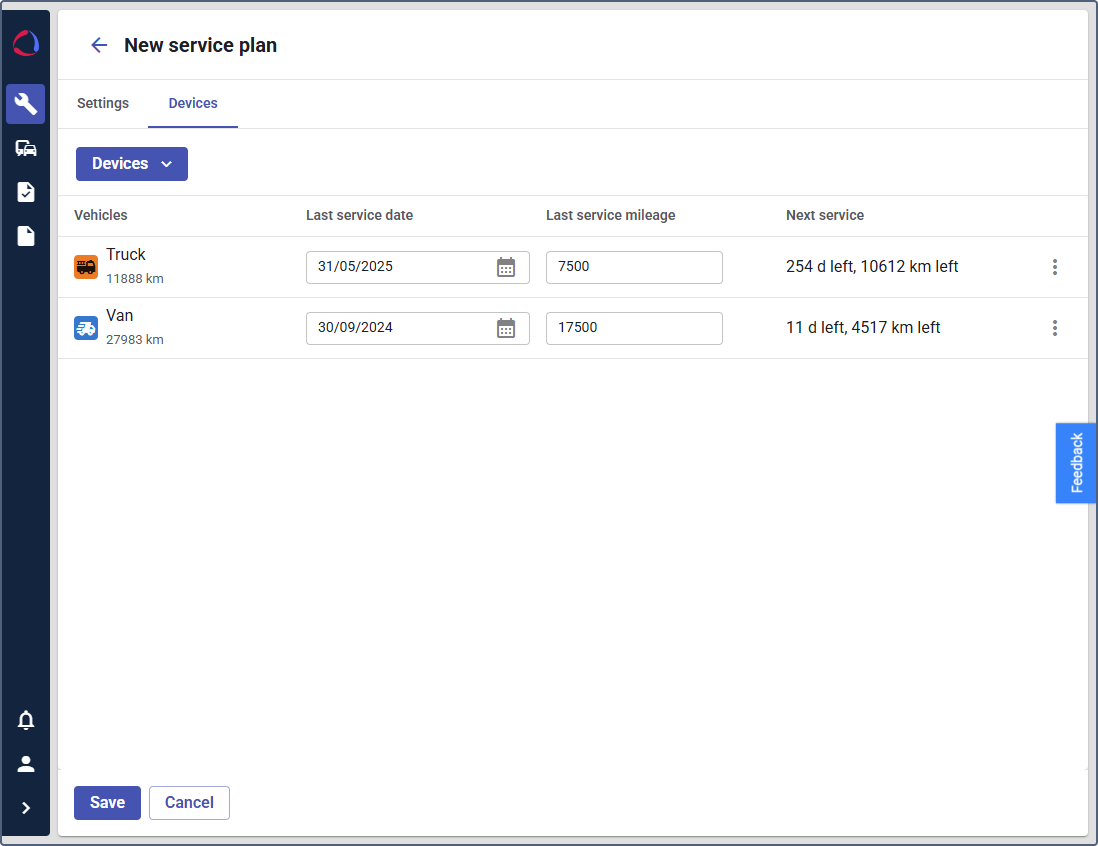 to select it. - In the Last service mileage column, enter the device mileage at the time of its last service.