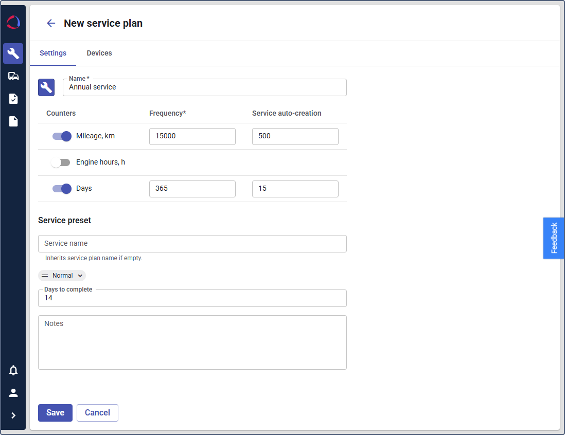 To ensure that recurring maintenance tasks are not missed, you can define service plans that automatically schedule services based on calendar days, mileage, or engine hours. To do this, follow the next steps:
