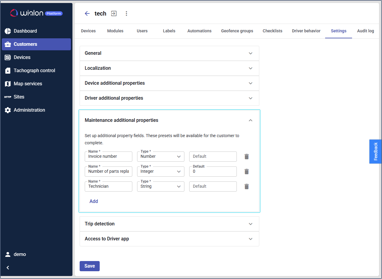 To allow your customers to capture consistent and tailored data for their maintenance services, you can define a set of additional properties. An additional property can record such information as the technician’s name, invoice number, number of parts replaced, whether the device is ready for use upon service, and so on. To create additional properties: