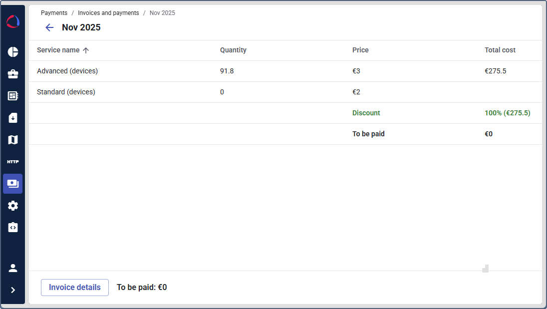 The Payments page is available in Wialon Platform Studio and is designed to help service providers view information about their monthly payments and invoices.