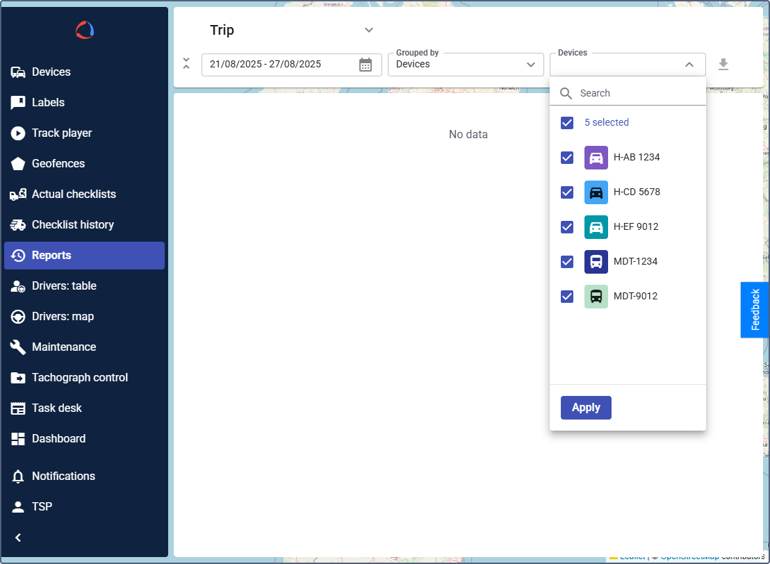 - (For the Trips report only): In the Grouped by field, select whether to group the results by drivers or devices. Other report types may not require this option.