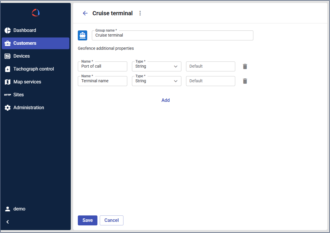 Geofence groups help you organize geofences and add consistent data in additional properties to them (for example, port names, contact details).