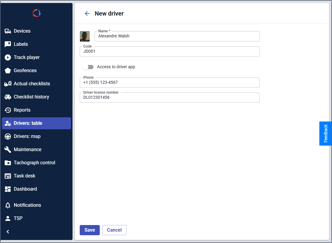 After filling in all required information, click Save to add the new driver to the system.