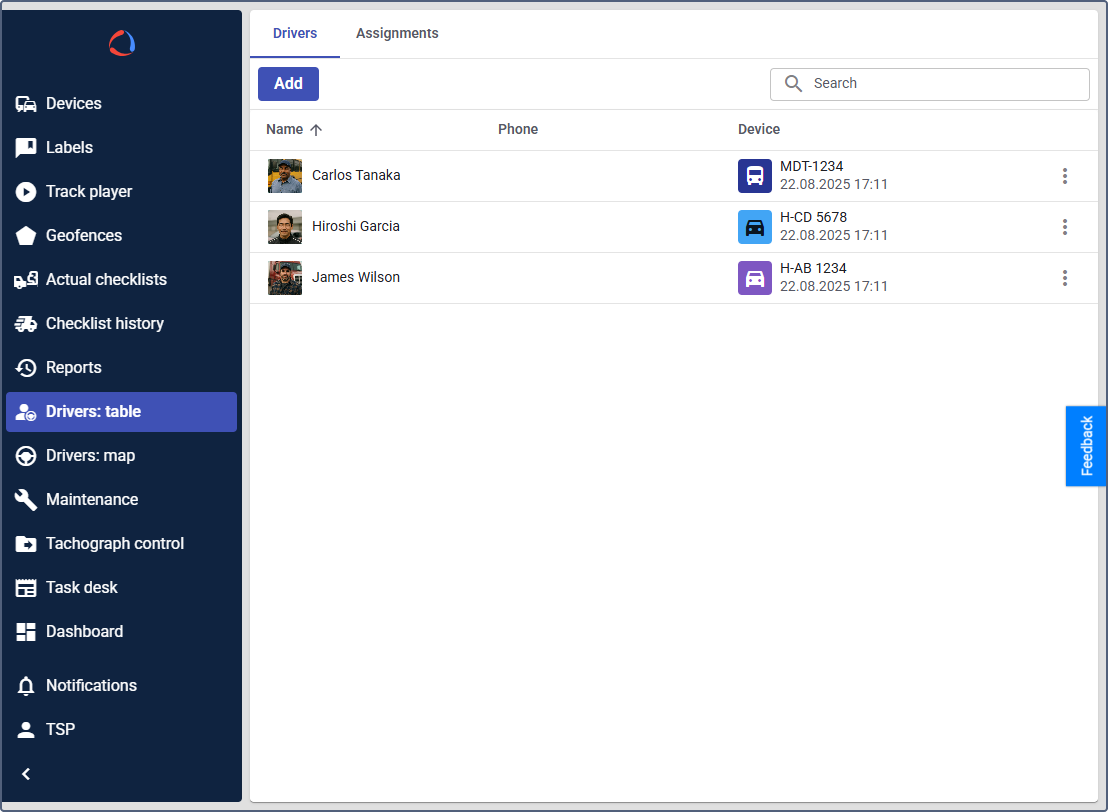- Manage assignments: View and modify driver-device assignments, including historical and future ones.