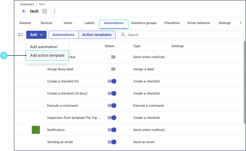 On the Automations tab, click the Add button and select Add action template to create a new action template.