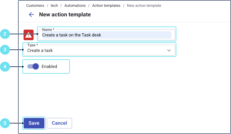 In the Name field, enter a descriptive name for the action template (for example, “Create a task on the Task desk”).