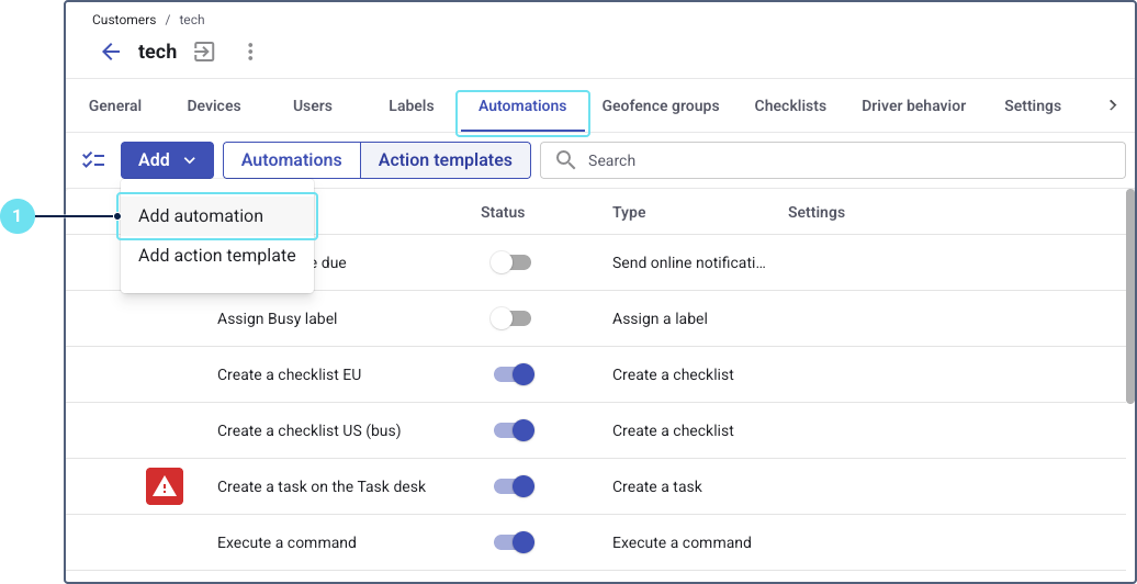 - On the Automations tab, click the Add button and select Add automation to create a new automation.