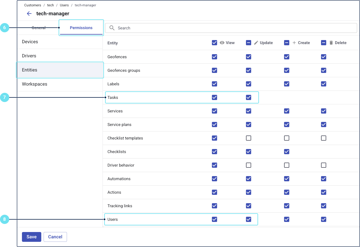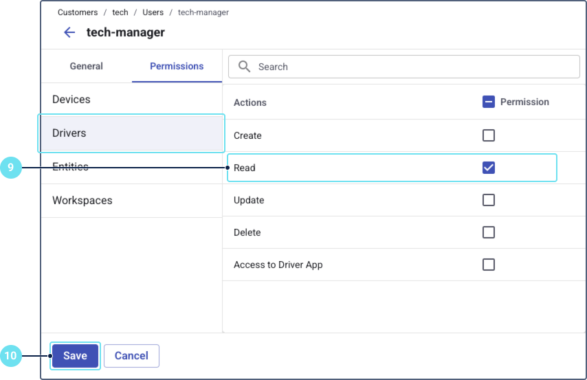 - Under the Drivers category, select the Read checkbox to allow the user to see the driver’s name on the task card. The driver’s name is displayed if they was assigned to the device when the task was created.