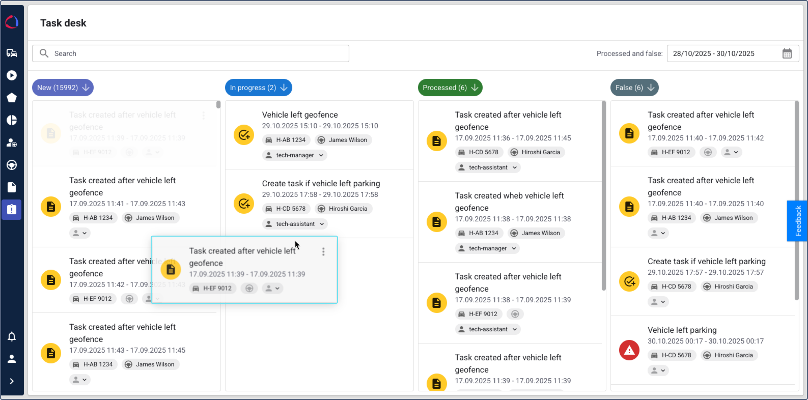 To view tasks, navigate to the Task desk page in Wialon Platform FleetSpace. The page displays tasks organized into columns: New, In progress, Processed, and False.