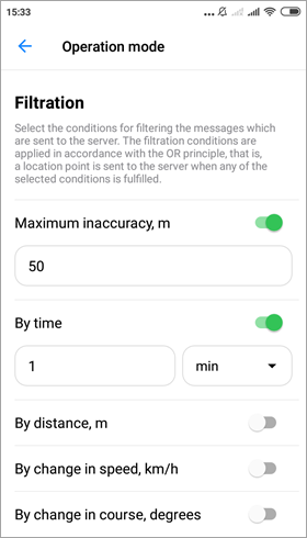 The filtration criteria work in accordance with the OR principle, that is, a positional point is sent to the server when a message is considered valid according to at least one criterion.