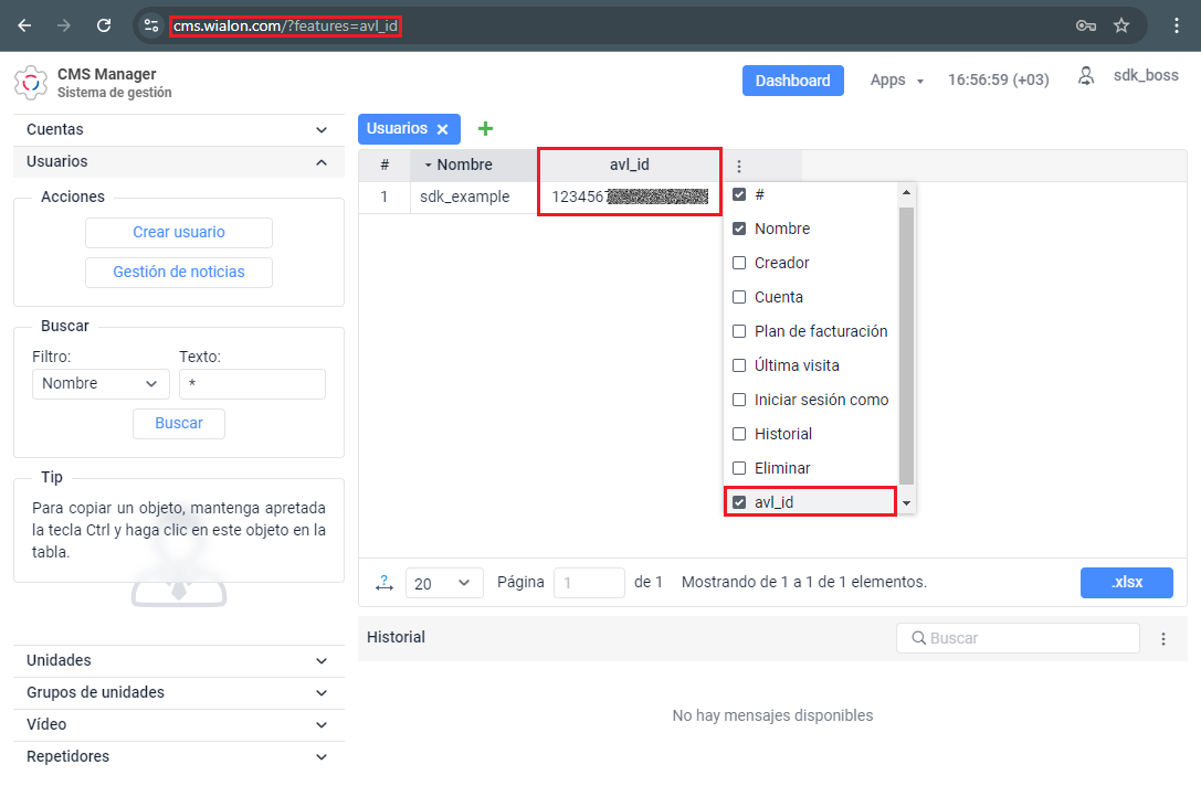 Para que se muestre la columna avl_id, es necesario iniciar sesión en el CMS, añadiendo al final del enlace ?features=avl_id. Un ejemplo de dicho enlace se muestra en la imagen a continuación.